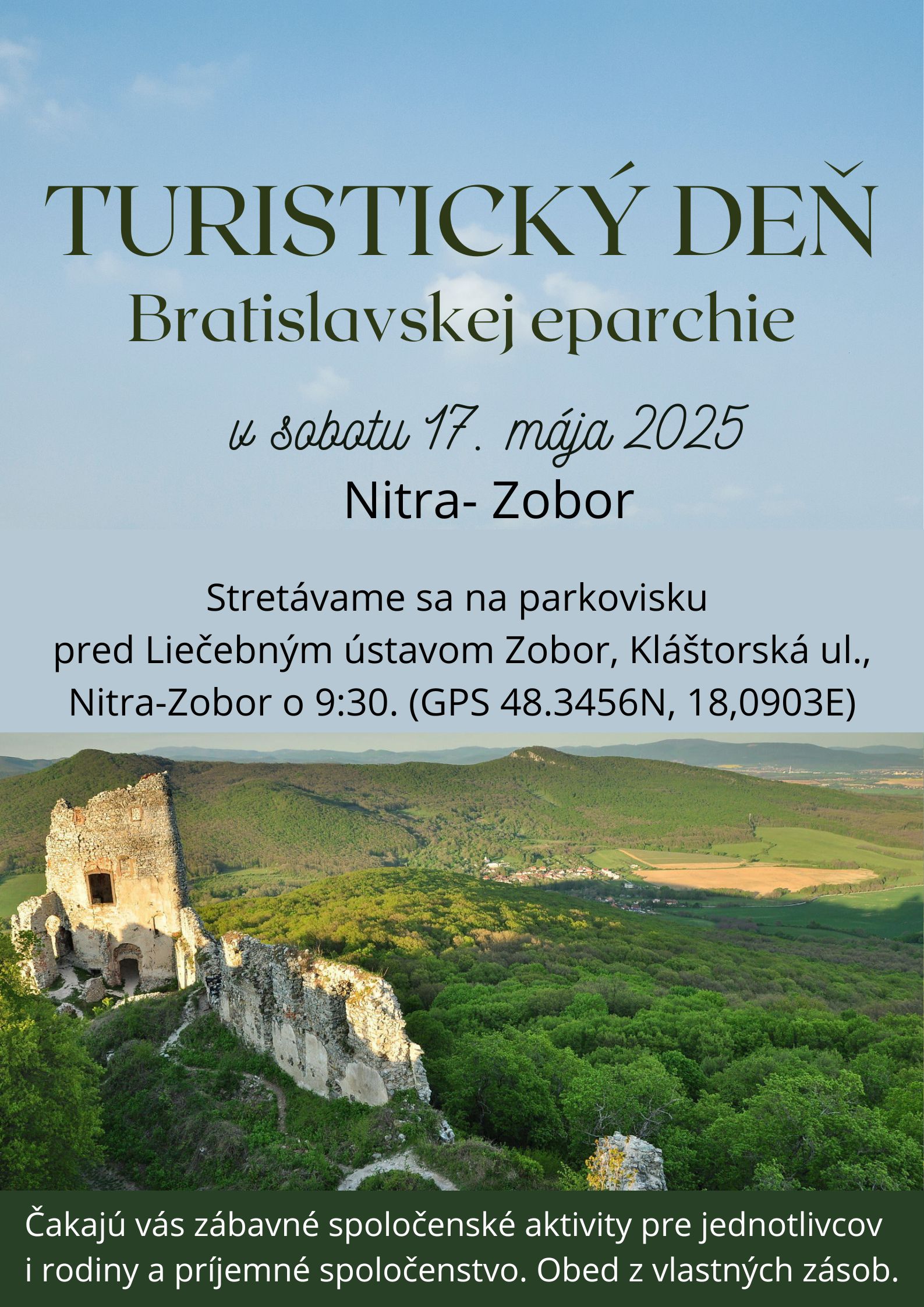 Túto sobotu je turistický deň našej eparchie, začína o 9:30 hod. a cieľom je Zobor pri Nitre. Viac info v priloženom plagáte.
